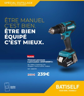 Pour réussir tous vos travaux, l’enseigne propose une grande sélection d’outils électroportatifs et d’outils à main : perceuses, scies, meuleuses, ponceuses, visseuses, clés, accessoires de mesure et protections individuelles. Les folders Batiself recensés sur Biscuit présentent souvent des packs outils et des remises intéressantes.